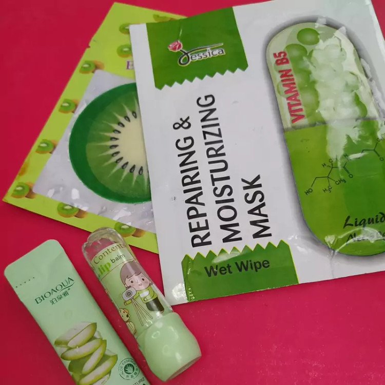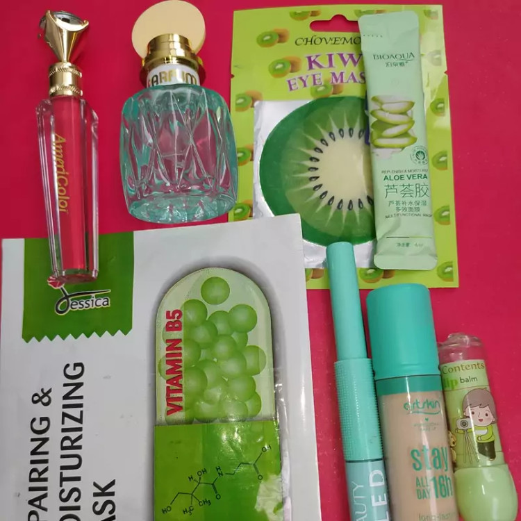 پک لوازم آرایشی سبز ۸تیکه شامل: ادکلن اورجینال زنانه رژلب مایع الماسی کانسیلر فول کاور آرت اسکین ماسک ورقه ای کپسولی ویتامین b5 بالم لب عروسکی پچ چشم میوه ای کیوی 🥝 خط چشم رنگی سبز آبی +اشنتیون ماسک ساشه ای آلوئه ورا +ارسال رایگان
