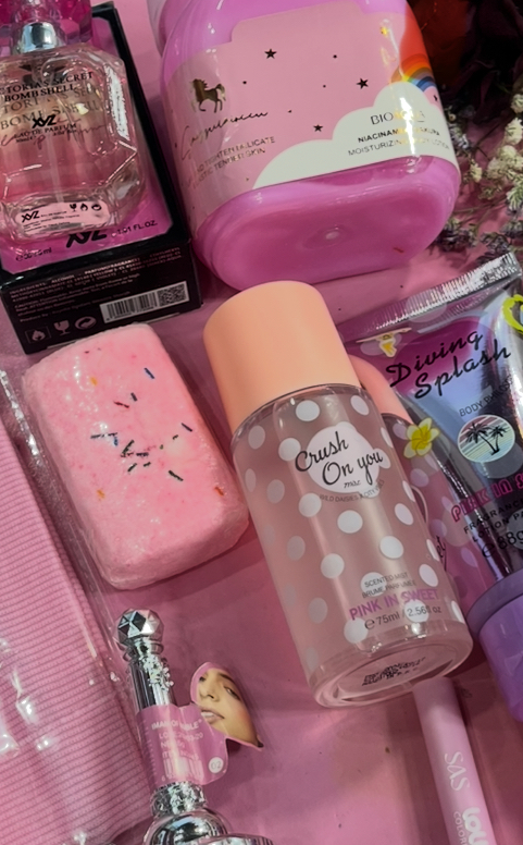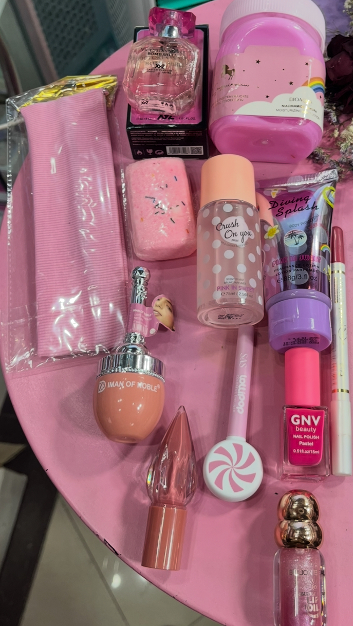 پک هدیه لوازم آرایشی صورتی جذاب 🩷 شامل: ادکلن ۳۵میل اماراتی کره بدن هدبند ترند کوکتل پدیکور بادی اسپلش لوسیون بدن رژلب مدادی لاک ناخن رژگونه پرنسس رژلب مایع خط چشم صورتی لیپ گلاس